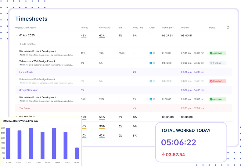 • Timesheets, work logs, and invoices align without gaps