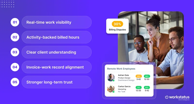 Ans: When clients can clearly see work as it happens, there is less doubt at invoice time, which directly lowers disputes and follow-up questions.