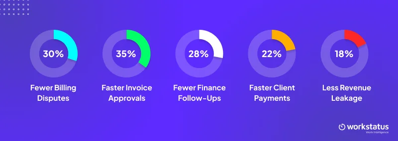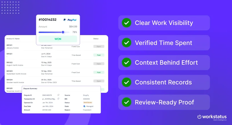 With Workstatus, daily work automatically becomes client-ready proof, helping teams reduce billing disputes, protect revenue, and get invoices approved with confidence.