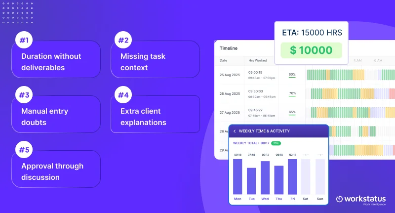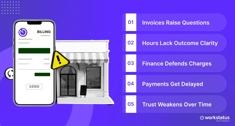 Late visibility leads to billing friction; real-time tracking keeps clients aligned early.