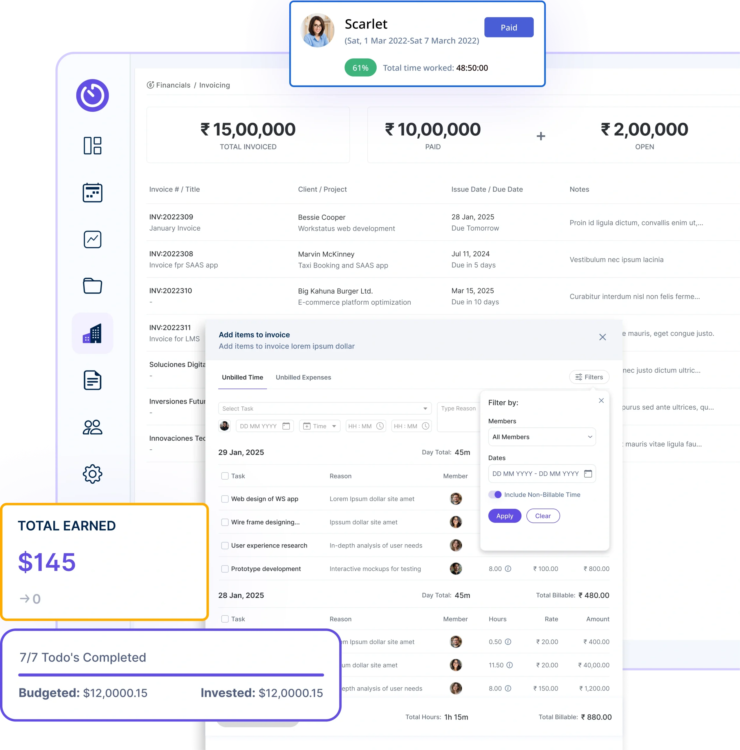 Clear visibility into billable hours and invoice-ready time, ensuring accurate billing and healthier margins.